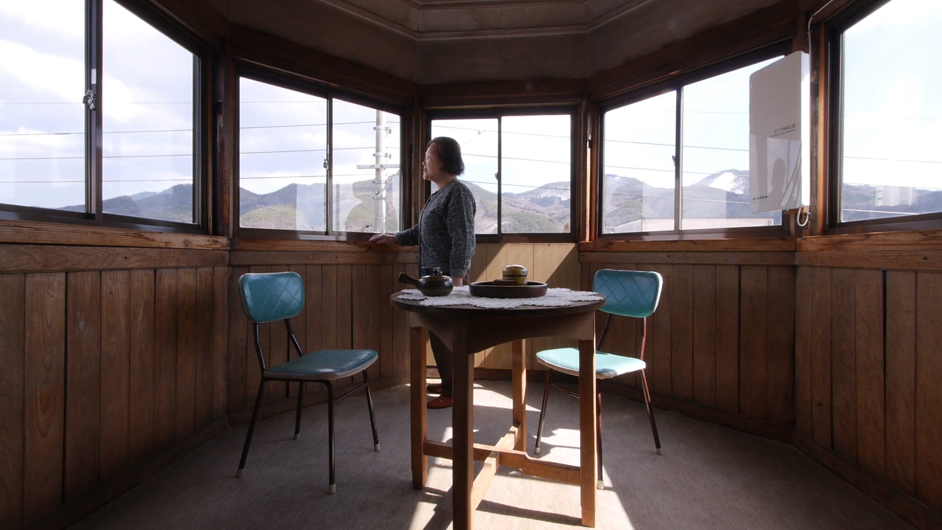 「家を守る」には1カットだけ、山が映っているシーンがあります。松葉屋旅館の望楼で、中村保子さんがお茶を飲んで、一息ついているシーンです。保子さんの背後にパノラマに広がる窓から、大町を囲む山の一部を見る事ができます。この作品で山はこれ以外現れませんが、映像として直接表現しなくても、山は作品制作に大きな影響を与えています。