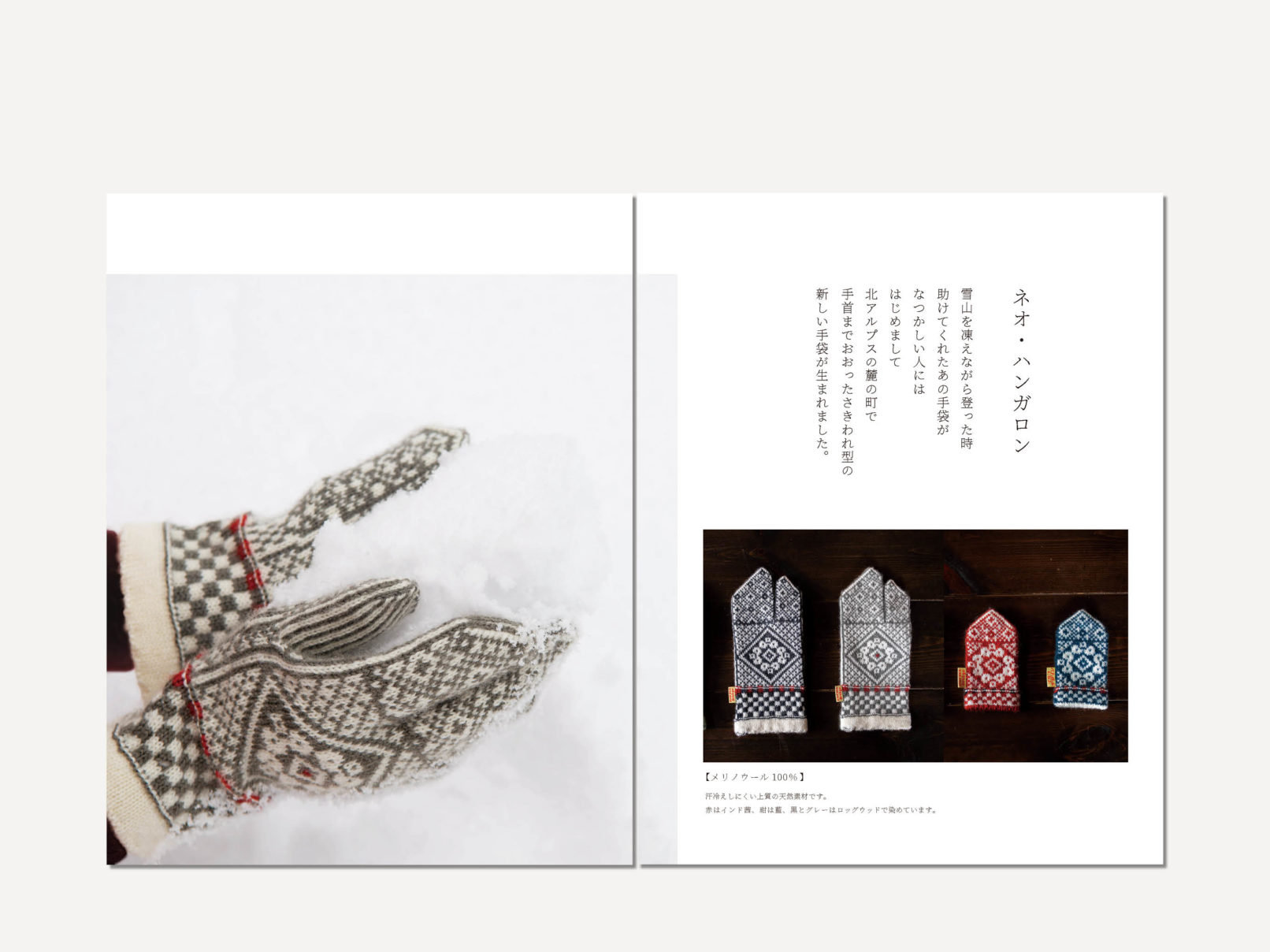 ラトビアミトンに感動して、北アルプス山麓に暮らしながら手編みの手袋を制作するマルコデザイン。ふとした山岳案内人との出会いから生まれた、新しくて懐かしい手袋「ネオ・ハンガロン」を紹介するフリーペーパーを発行しました。マルコデザインの好きなものがぎゅっと詰め込まれた冊子です。