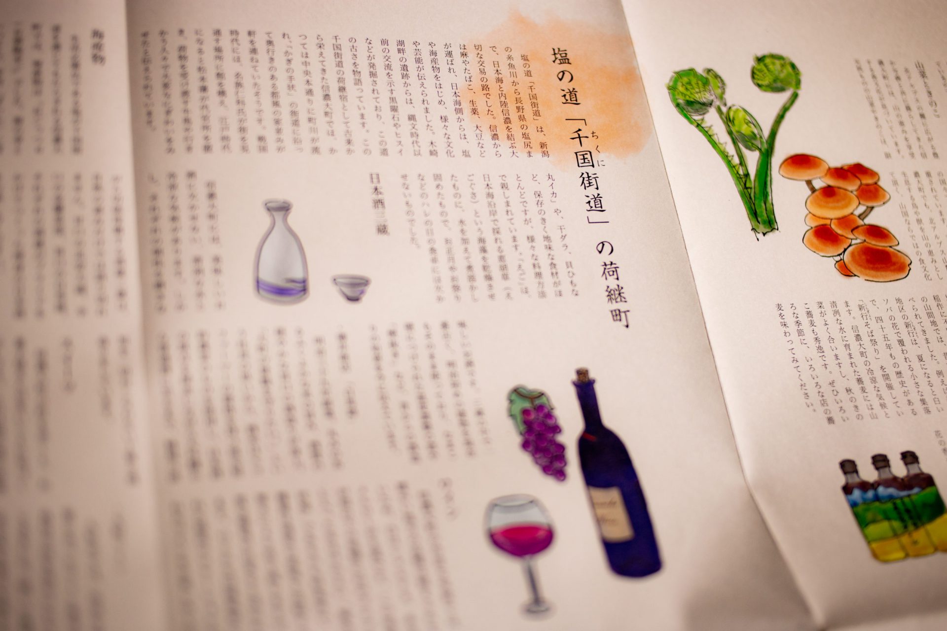 長野県大町市の食文化を、山の食材、水の恵み、千国街道の宿場町、雪国という4つの視点から網羅的に紹介するリーフレットを制作しました。